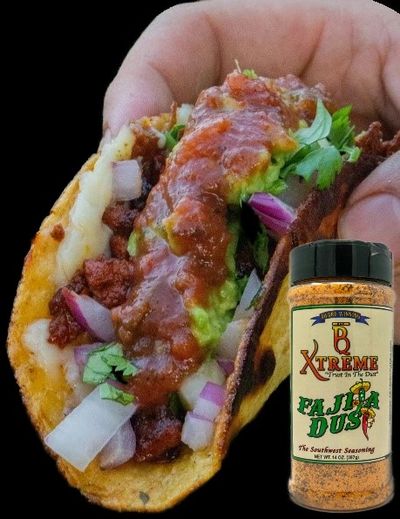 1. Preheat your fire to medium-high and place your skillet or griddle on it. Let it heat for about 2 minutes until it reaches 375°F. Next, add the ground chorizo and season it with B Xtreme Fajita Dust. Cook the chorizo for 6 to 8 minutes, stirring occasionally, until it is fully cooked. Remember to chop it into smaller pieces for maximum caramelization. Once it's done, set it aside and prepare to make the taco shell.