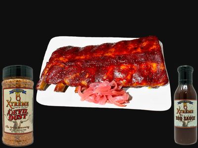 2. Spray both sides of the ribs with olive oil and season them evenly with BXtreme Devil Dust. Let the rub melt into the ribs for 30 - 40 minutes, then place the ribs on a wire rack.