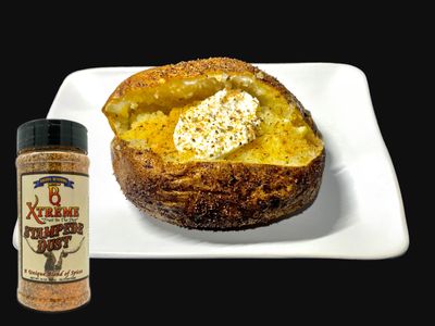 6. Add a tablespoon or two of butter, sprinkle with B Xtreme Stampede Dust, and top with a dollop of sour cream or your desired toppings.